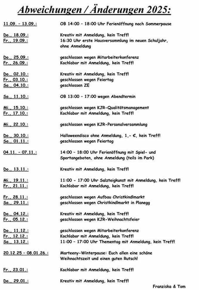 Ergänzung: Dienstag, 21.10. geschlossen wegen Teamklausur Dienstag, 28.10. 16:45 Hausversammlung im offenen Treff Die Halloweendisco findet nicht am Donnerstag, 30.10. sondern am Freitag, 31.10. (Reformationstag) statt! Samstag, 08.11. geschlossen wegen Zeiteinbringung (ZE) Sonntag, 09.11. Mutter-Tochter-Tag ist leider abgesagt Freitag, 14.11. ab 18:00 Uhr Oldie-Abend: Von 18:00 bis 20:00 Uhr ist der offene Treff nur für Gäste ab der 3. Klasse (auf Wunsch aus der Hausversammlung). Dienstag, 16.12. geschlossen wegen Erste-Hilfe-Kurs Die Winterpause beginnt wegen Abfeiern von Urlaubstagen leider schon am 17.12.25. |